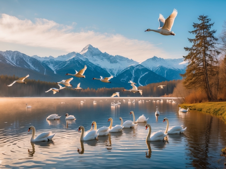 白鳥の群れが休息し、また飛び立つというシーンを描画しました。代表的な動物は特徴的な動きを加えて、描画を試みています。